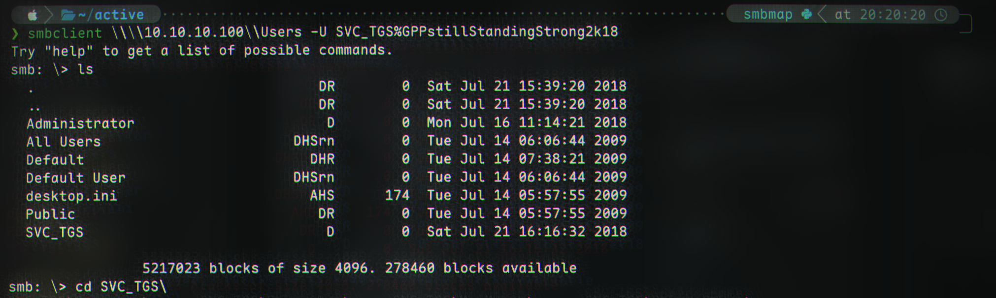 smbclient \\\\10.10.10.100\\Users -U SVC_TGS%GPPstillStandingStrong2k18