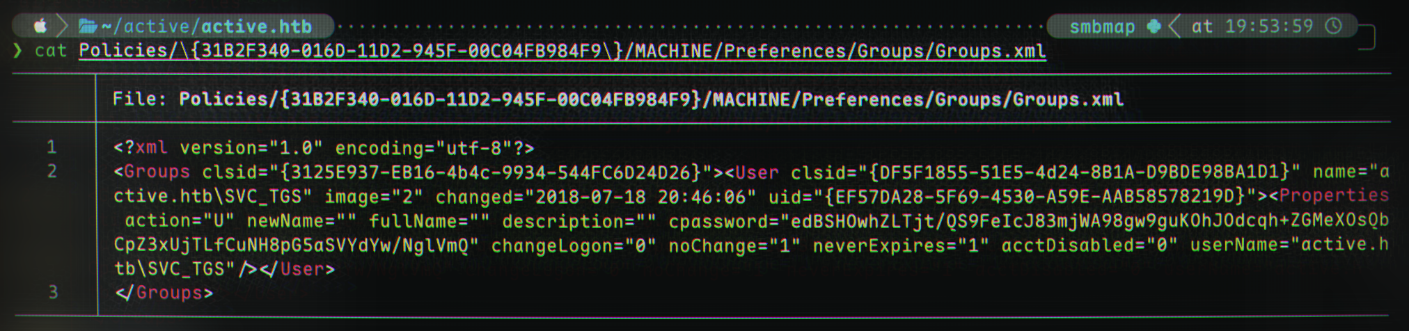 Hmm. There appears to be quite a bit of information: we can see an account named SVC_TGS on the domain active.htb. There also appears to be some sort of encrypted password in the field cpassword with the value edBSHOwhZLTjt/QS9FeIcJ83mjWA98gw9guKOhJOdcqh+ZGMeXOsQbCpZ3xUjTLfCuNH8pG5aSVYdYw/NglVmQ.