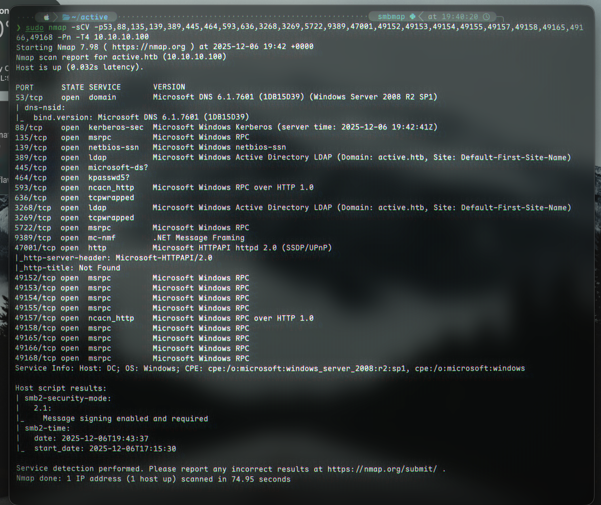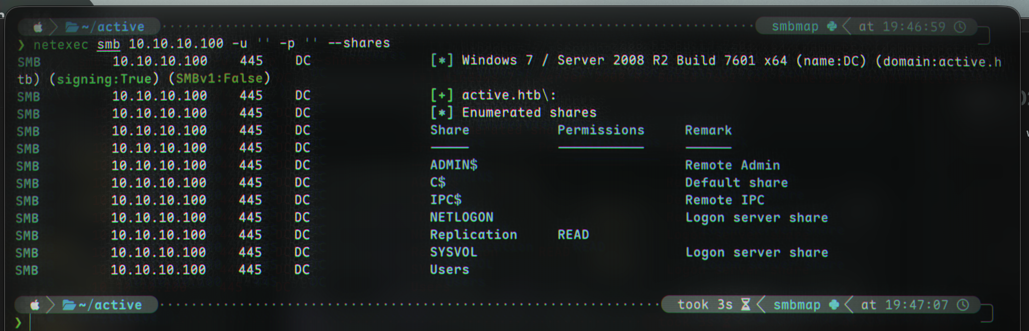 SMB 10.10.10.100 445 DC [*] Windows 7 / Server 2008 R2 Build 7601 x64 (name:DC) (domain:active.htb) (signing:True) (SMBv1:False)