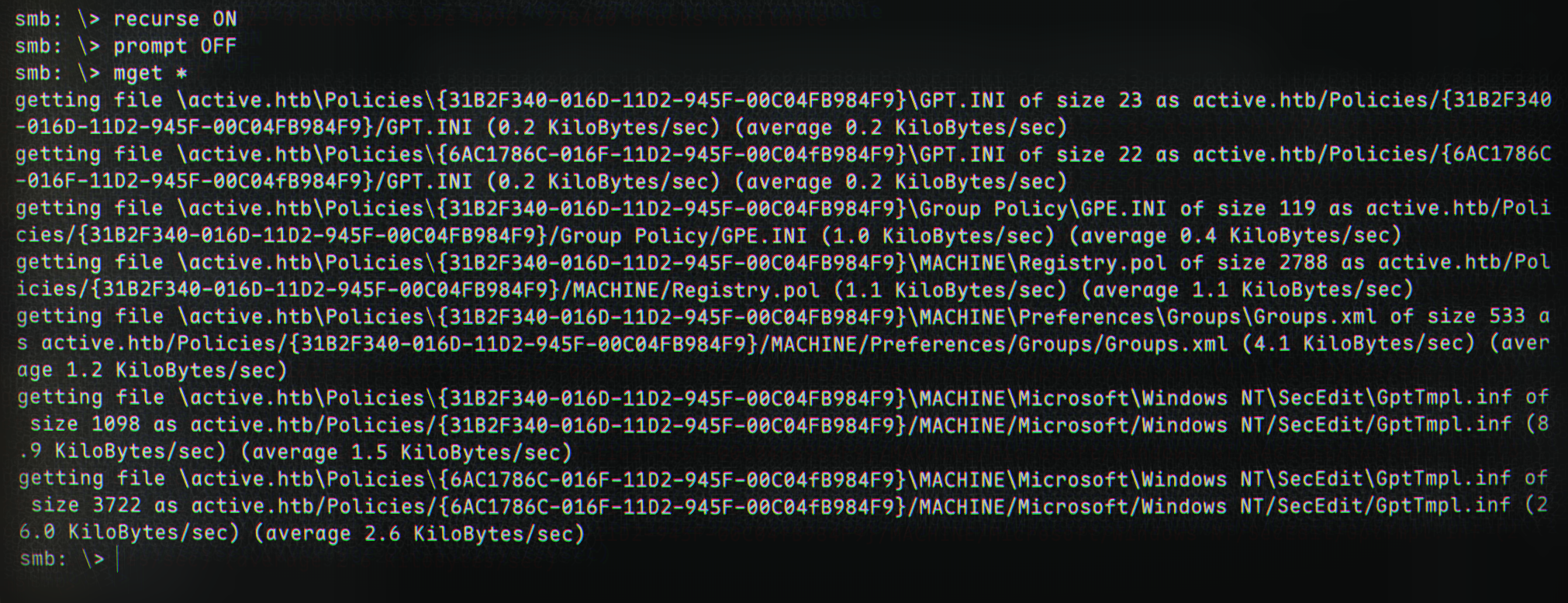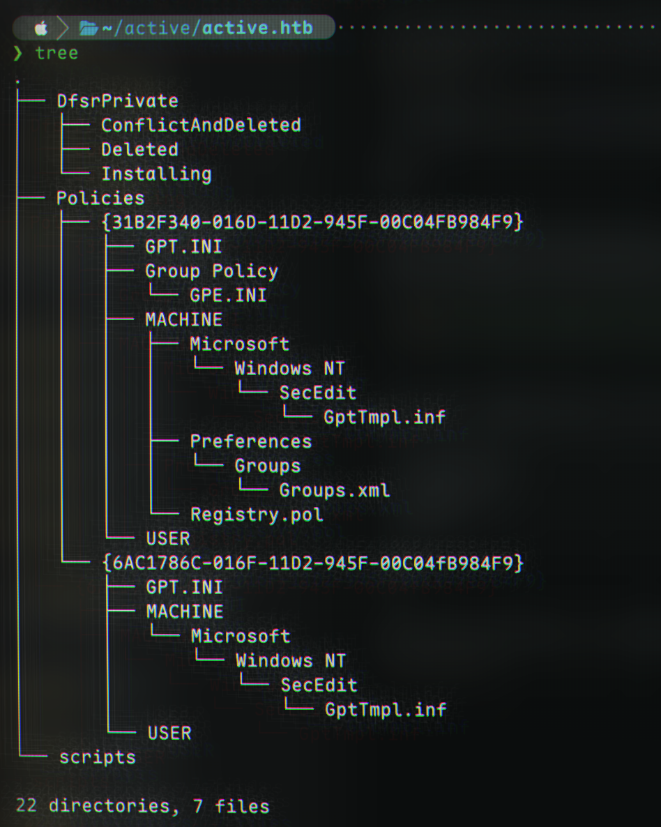 We can now exit the smb shell and examine the files in the newly downloaded folder, active.htb.