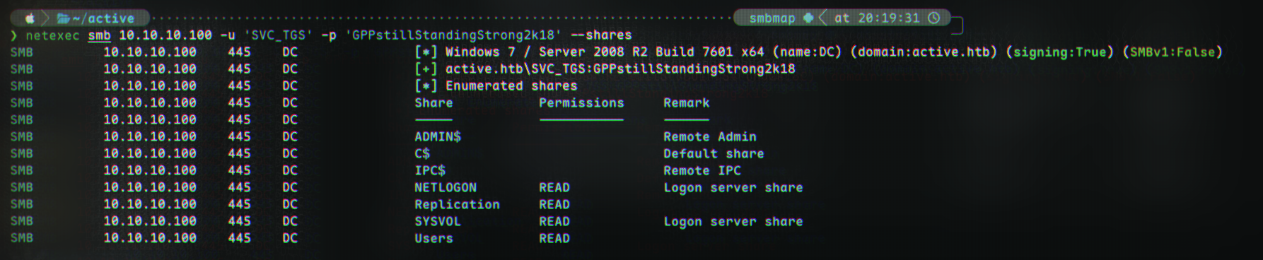 SMB 10.10.10.100 445 DC [+] active.htb\SVC_TGS:GPPstillStandingStrong2k18