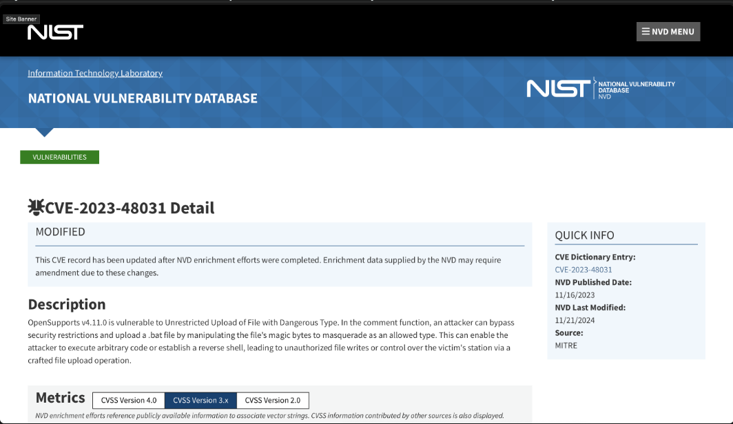 file CVEs/Vulns. Upon further enumeration, we find a CVE (CVE-2023-48031):
