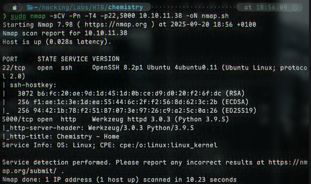 sudo nmap -sCV -Pn -T4 -p22,5000 -oN nmap-initial.sh 10.10.10.10