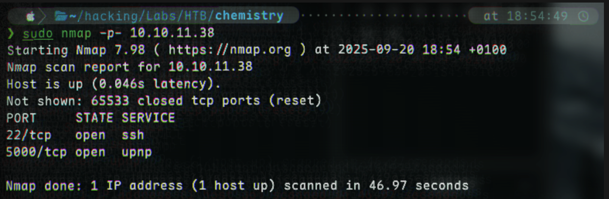 We begin with an initial port scan to find ports 22 and 5000 open: