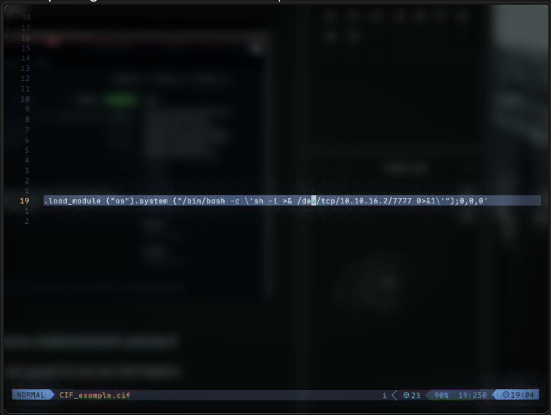We can then find a PoC script that will get us a shell: https://github.com/ex-cal1bur/CIF_Reverse_shell/blob/main/CIF_example.cif