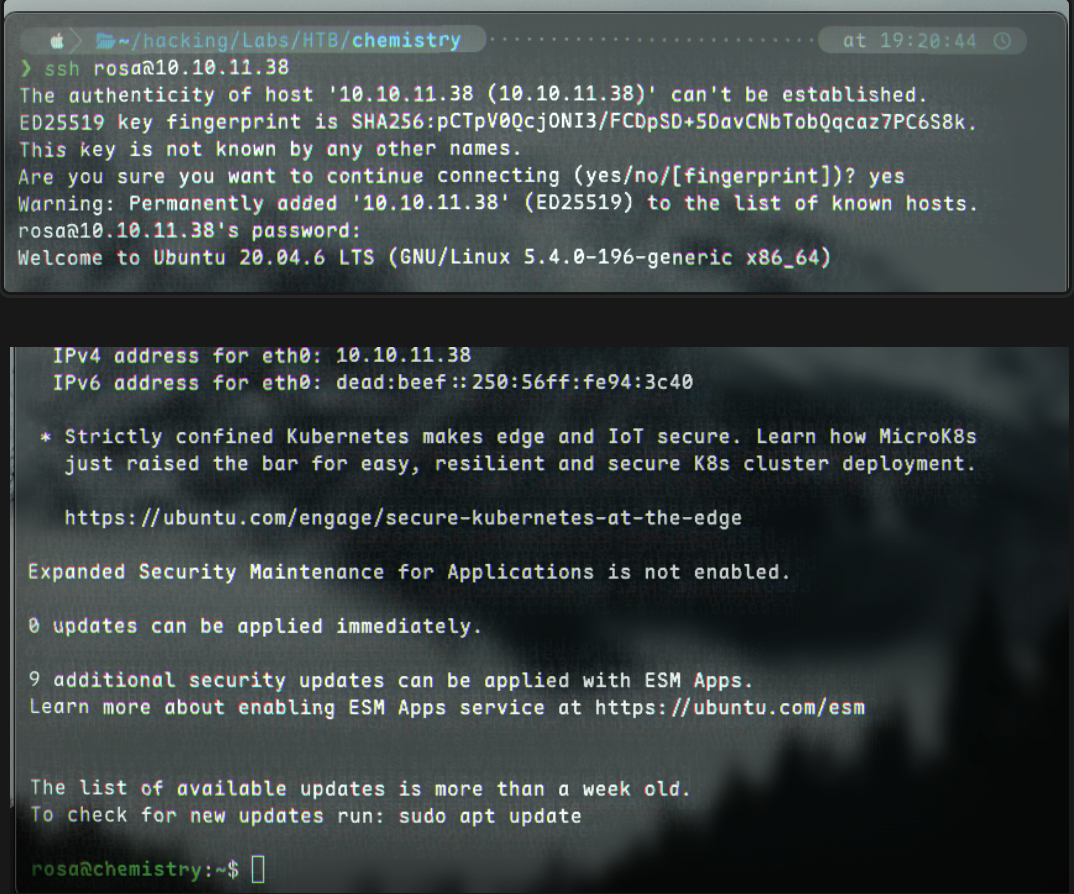 scan, we saw port 22 open for SSH. Let’s attempt to establish connection with rosa@chemistry
